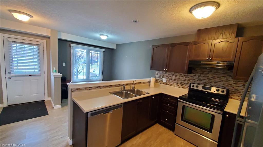 Welcome Home to This Impeccably Finished Townhouse in a Desirable Family Neighborhood!Step into this bright, move-in ready, 2-storey condo townhouse that has been professionally from top to bottom. The functional floor plan is ideal for growing family, featuring two spacious bedrooms and a full bathroom on the second floor, plus a large walk-in closet in the primary suite for ample storage. Entertain or unwind in the professionally finished walkout basement, complete with a full bathroom, offering flexible space that can easily serve as a third bedroom, home office, or indoor/outdoor flow perfect for hosting summer barbecues. Enjoy a truly maintenance-free lifestyle with landscaping, snow removal, and garbage disposal all included. The modern kitchen features sleek stainless steel appliances (cooktop oven, fridge, dishwasher), plus a washer, dryer, air conditioner, and water softener that are all included for your convenience. Conveniently situated near Fischer Hallman and Ottawa Street with easy access to Hwy 7/8.A SECON Parking spot is also available.